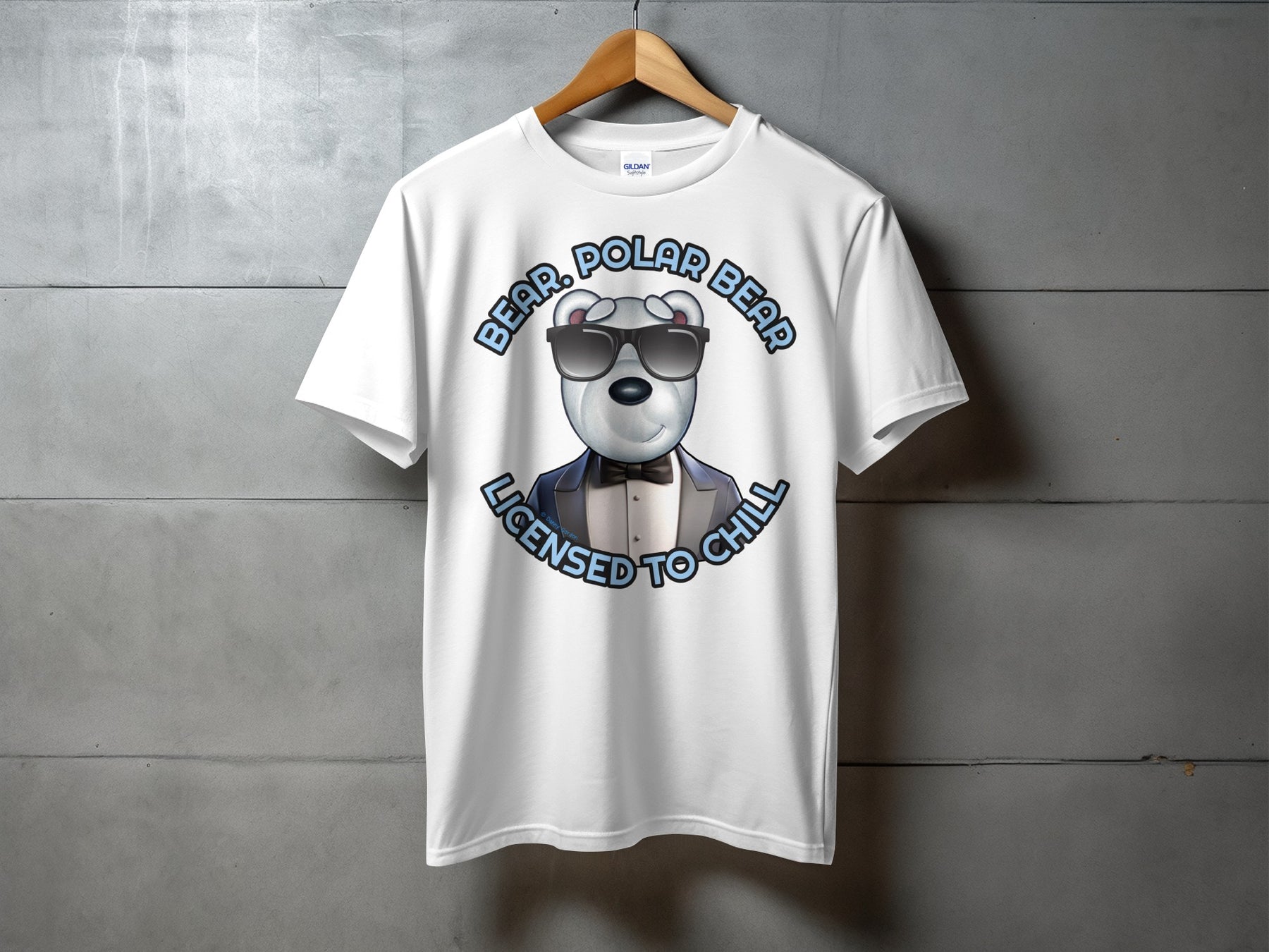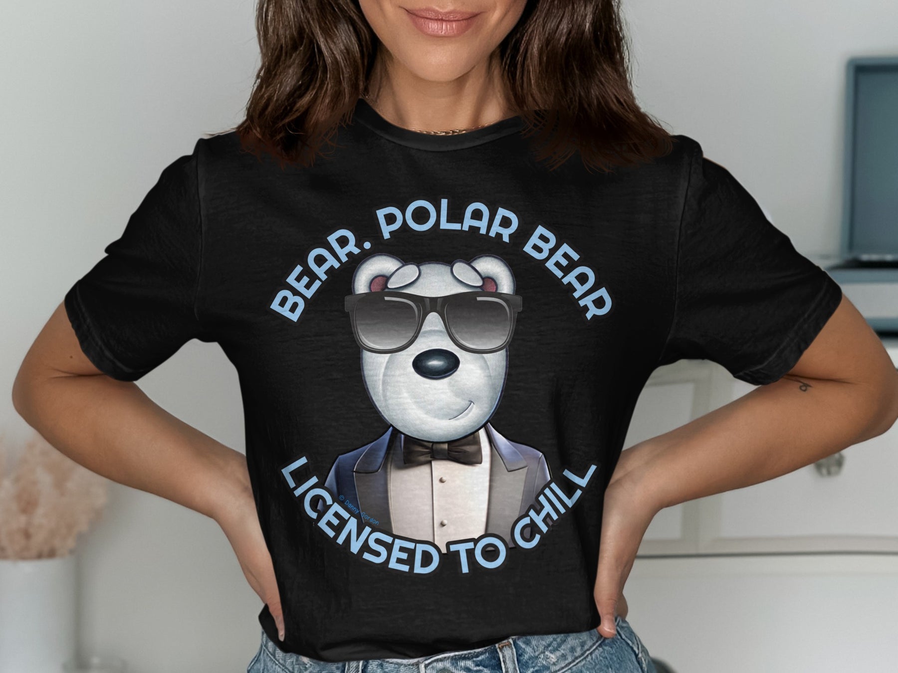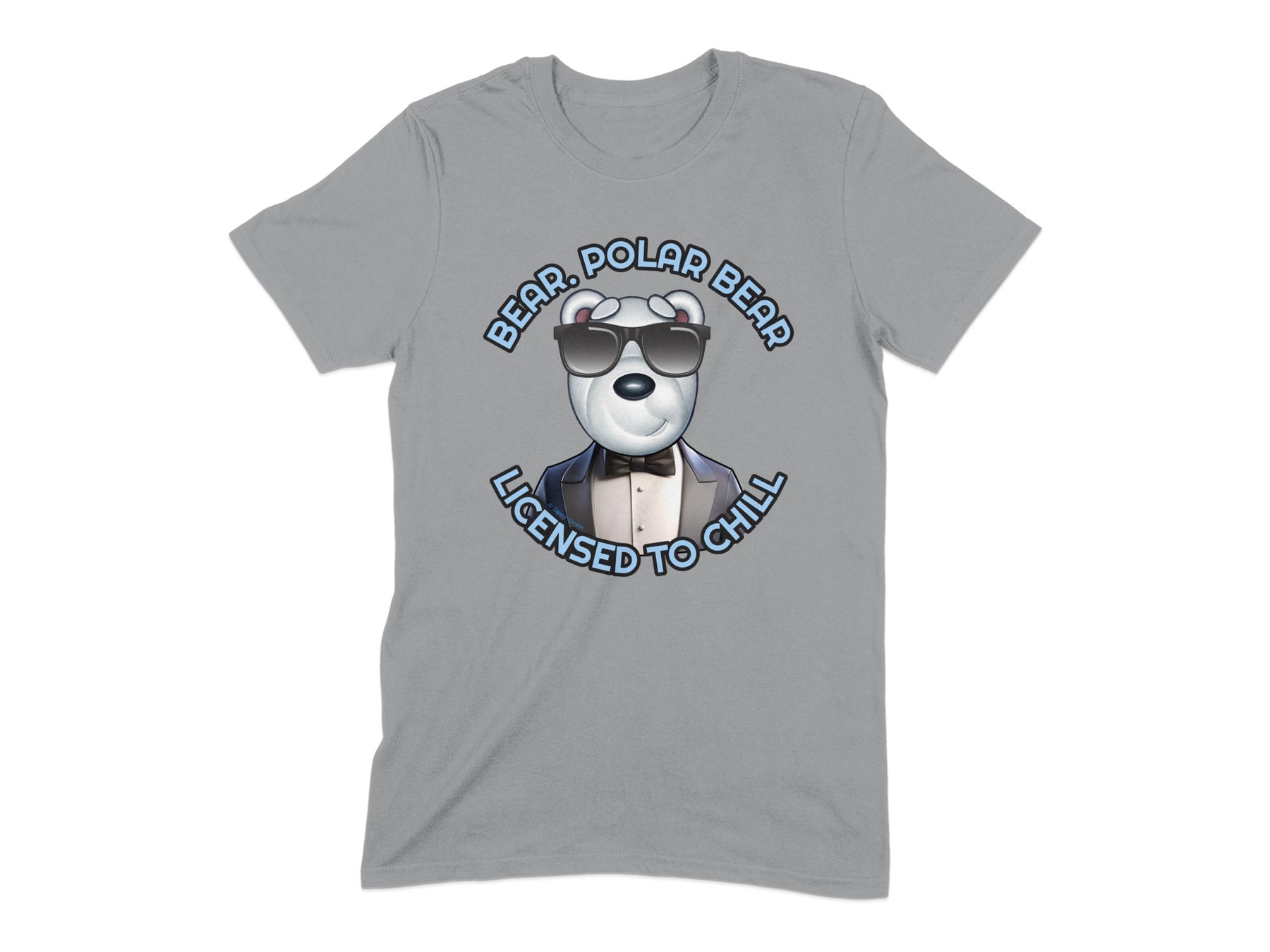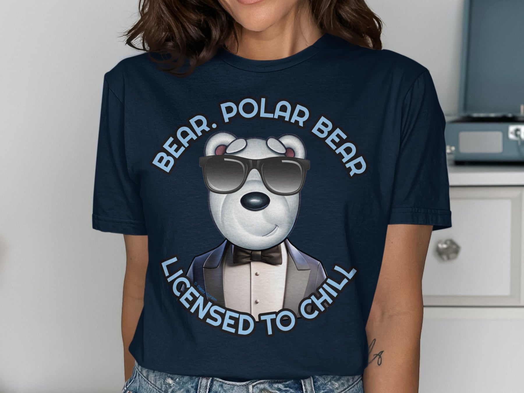 Introducing the "Licensed to Chill" T-Shirt, featuring a sophisticated polar bear sporting cool sunglasses and a dapper tuxedo. This unique design combines humor and style, making it a standout addition to any wardrobe. Perfect for those who appreciate a relaxed vibe and a touch of whimsy.