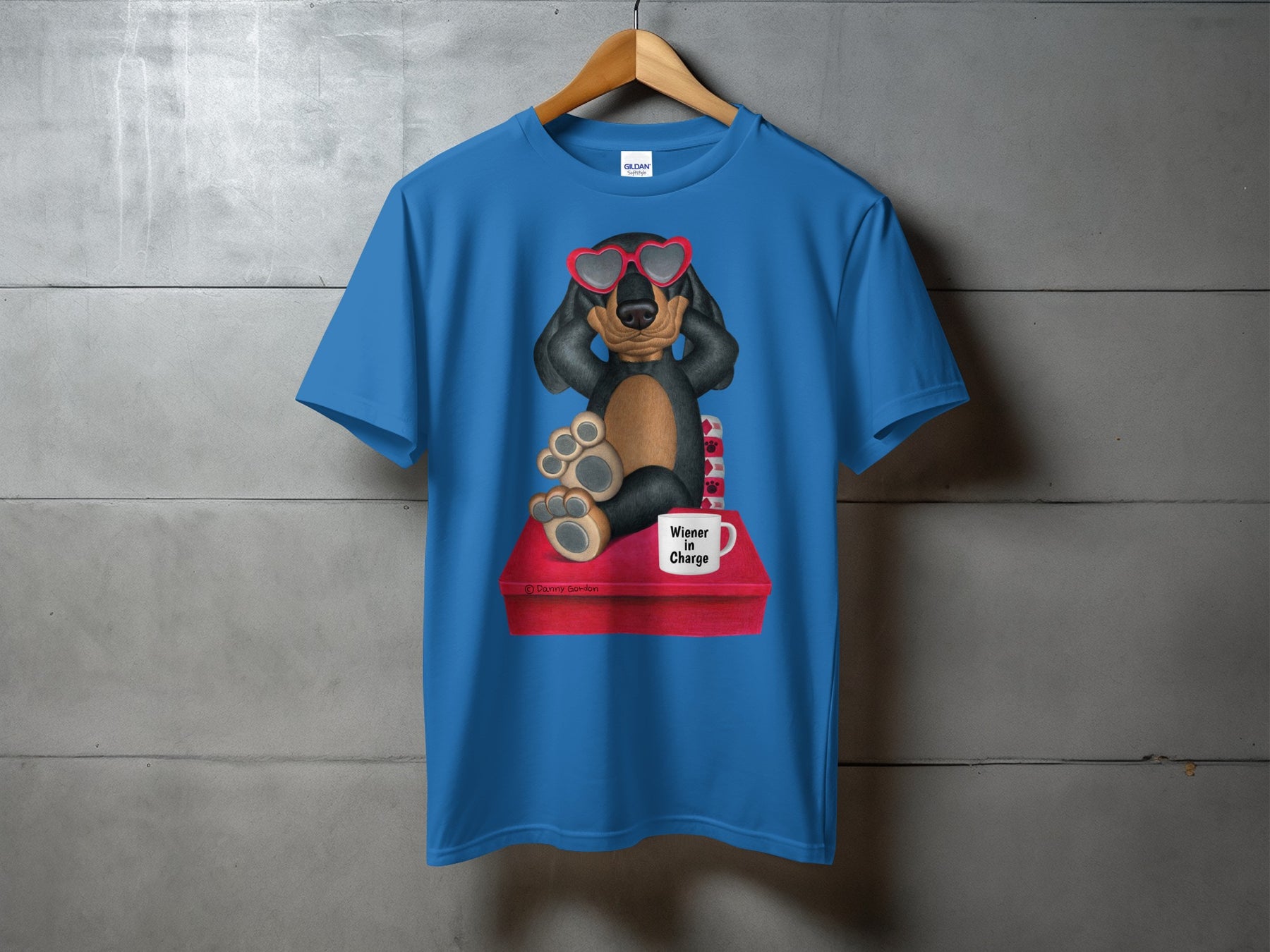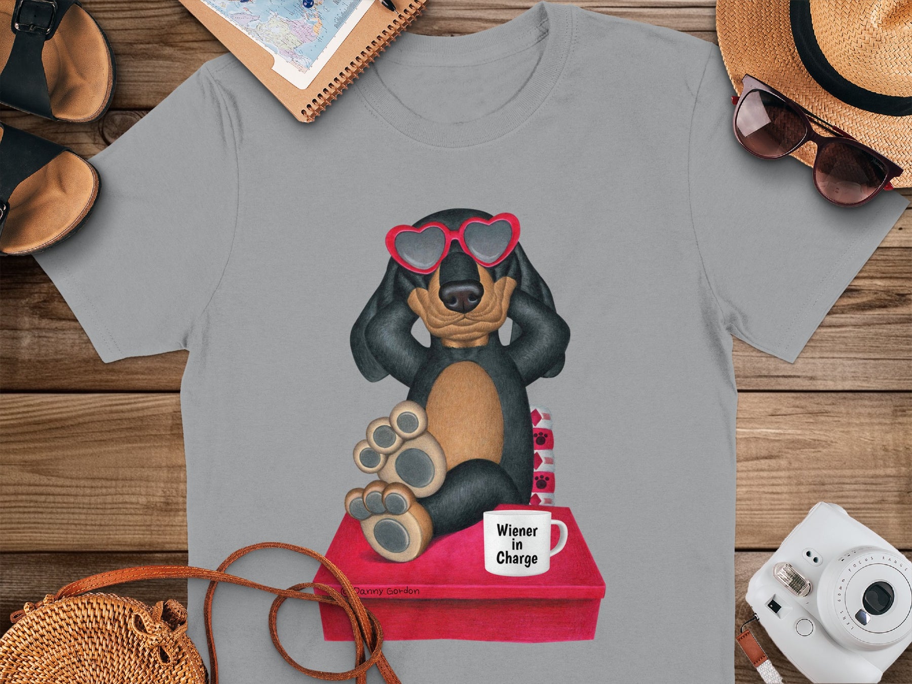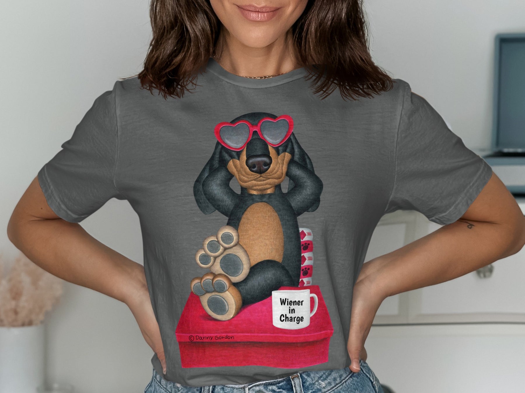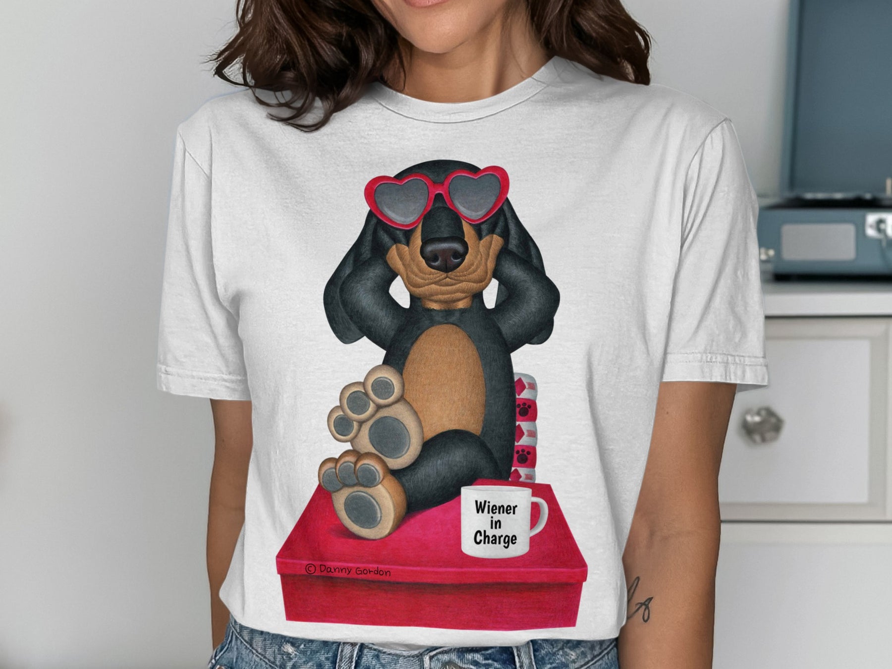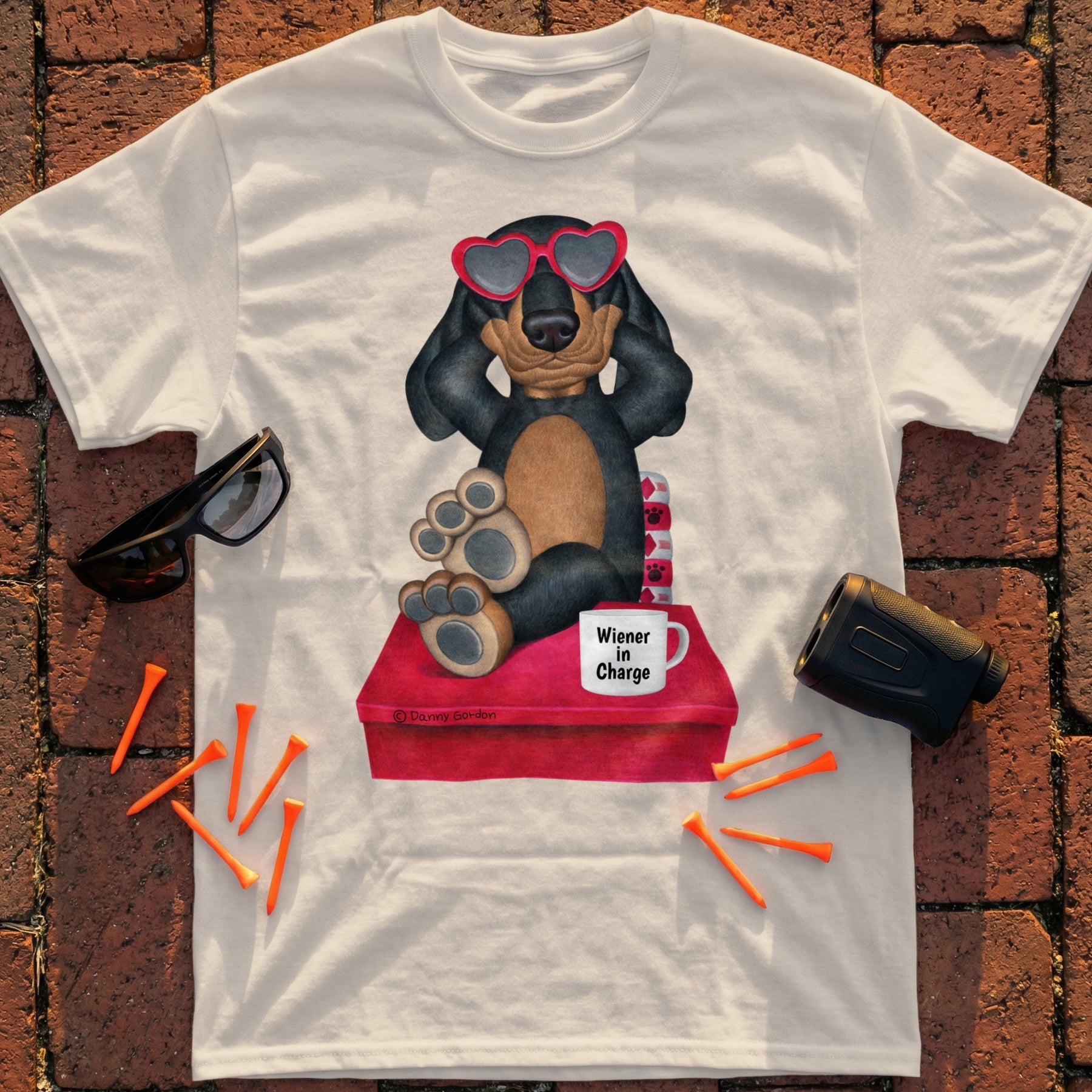 This T-Shirt features an adorable Dachshund dog wearing heart shaped sunglasses, adding a touch of fun and whimsy to your wardrobe. The design also includes a mug that says Wiener In Charge making it an amusing and playful piece. Perfect for dog lovers, this T-Shirt makes a thoughtful and unique gift.
