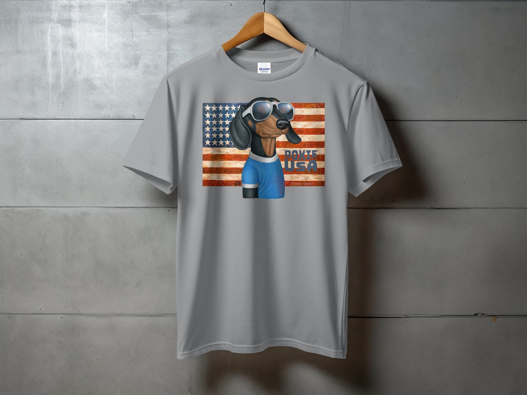 Show off your love for Dachshunds and America with this unique Doxie USA T Shirt! This adorable design features a cool Dachshund wearing sunglasses, set against the backdrop of the American flag. This patriotic shirt is perfect for any dog lover, especially Dachshund enthusiasts.